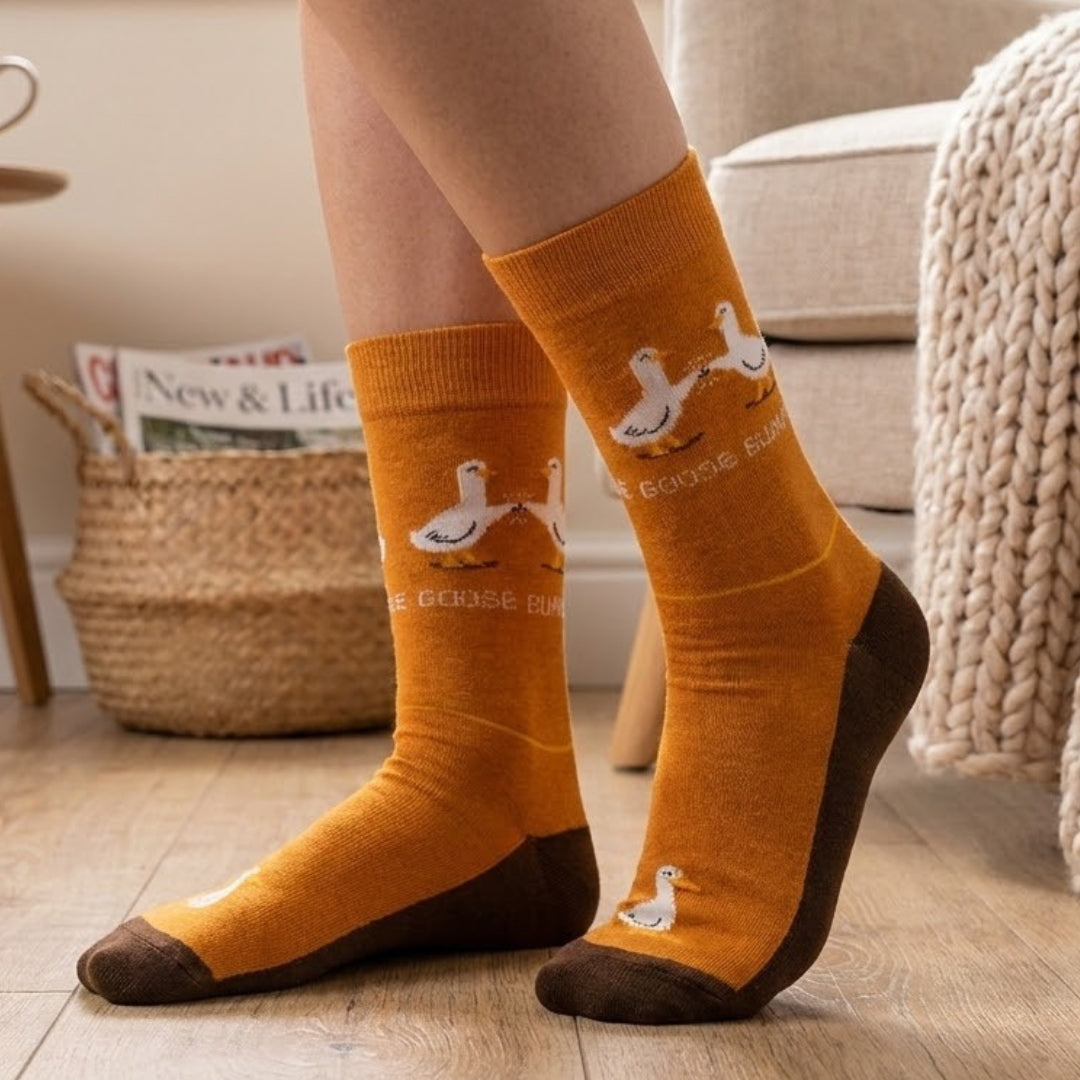 Cute, cozy, and full of charm. Featuring an adorable goose design and playful “goose bumps” detail, these socks are perfect for spreading smiles, staying comfy, and gifting a little lighthearted love.