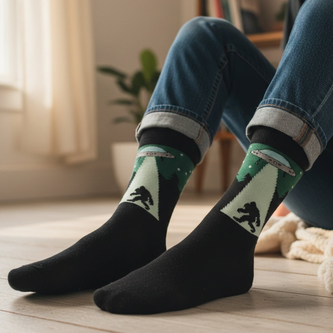 Was Bigfoot abducted by aliens and that is the reason no one could find him for the past 100 years? Possibly. Or, does Bigfoot not only have his own sock line, but also his own intergalactic aviation manufacturing business and currently makes UFO's just to rile up the United States government? Also very possible. Either way, these UFO Bigfoot socks are sure to send a shock wave through the fashion world.
