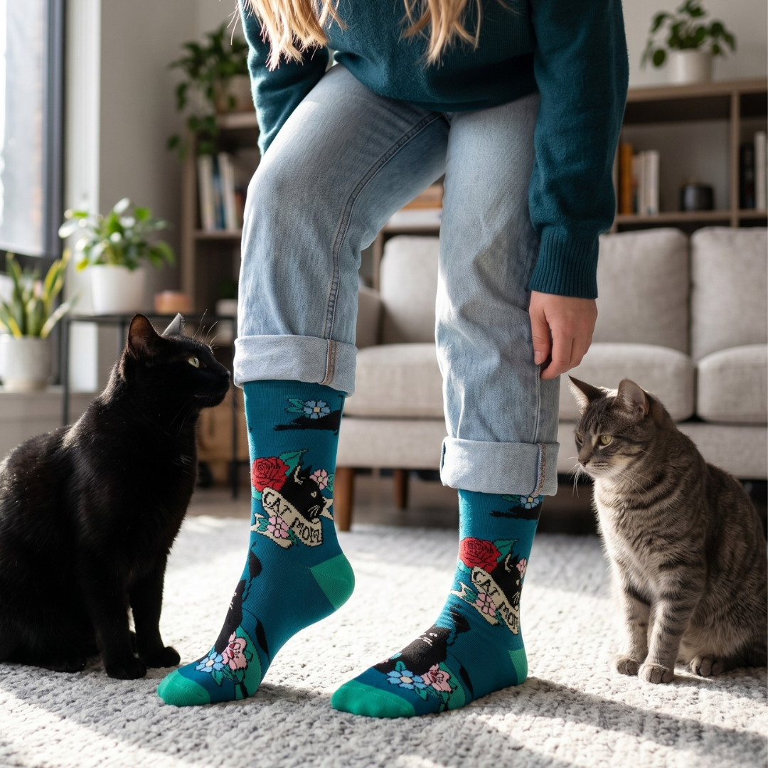 Proud, cozy, and full of cat love. These Cat Mom socks feature charming, tattoo-inspired cat artwork—perfect for showing off your cat-mom pride in comfort and style. 🐾🧦