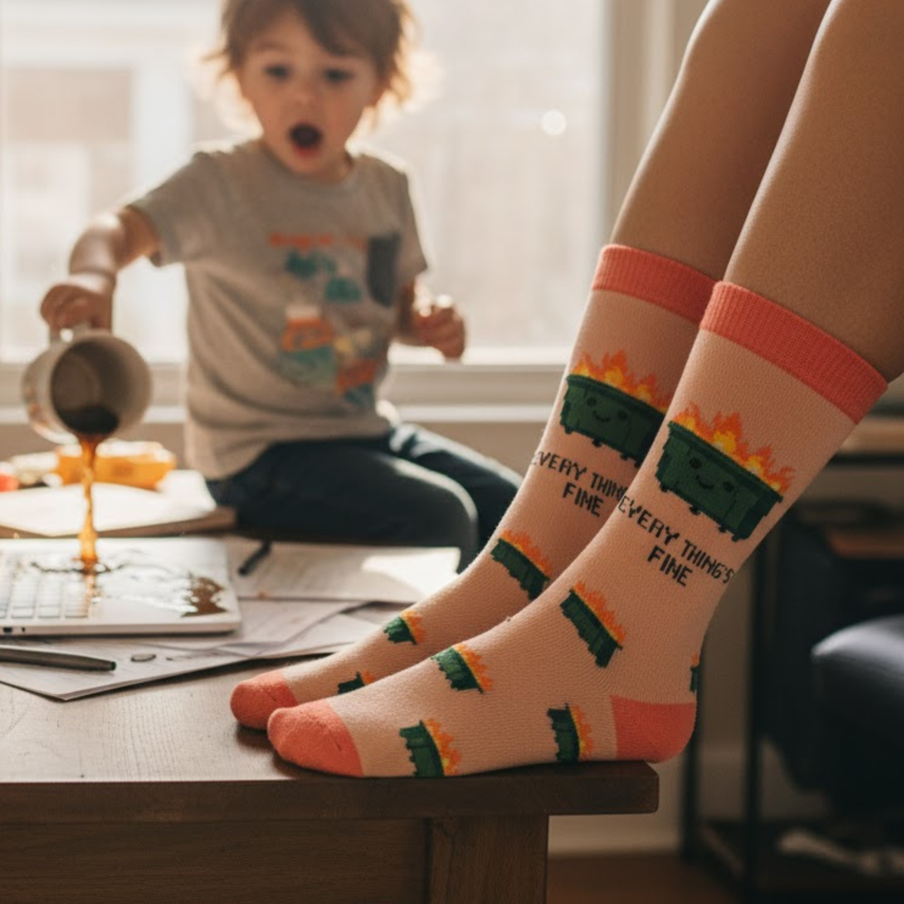 Showcase your sense of humor during chaotic times with our "Everything's Fine" Dumpster Fire socks! These amusing socks feature a quirky dumpster fire design and reassuring text, making them perfect for anyone looking to add a touch of irony to their wardrobe. Crafted from high-quality, soft, and breathable materials, our Everything's Fine socks provide all-day comfort while letting your feet make a bold, lighthearted statement. Shop now and embrace the chaos in style with these witty socks!